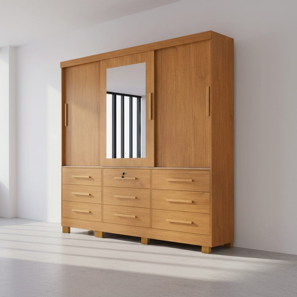 Com 3 portas de correr, sendo uma com espelho, e 9 gavetas internas (1 com chave), o Athenas garante armazenamento inteligente para roupas, acessórios e calçados. Seus cabideiros em alumínio oferecem resistência, enquanto as corrediças telescópicas proporcionam deslizamento suave das gavetas.