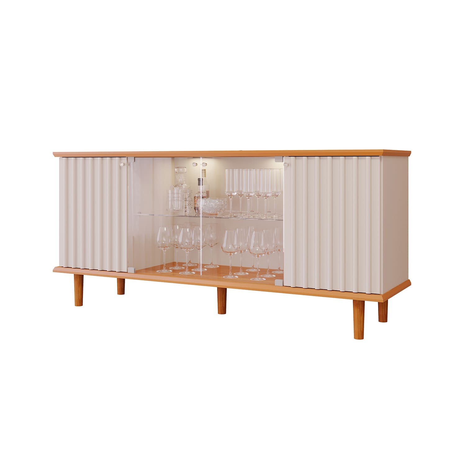 O Buffet Tifany é a peça ideal para quem busca aliar funcionalidade e sofisticação. Com 1,65 m de largura, ele se destaca pelo design contemporâneo, portas ripadas e iluminação em LED, criando um efeito elegante que valoriza os objetos decorativos no interior. O tampo em MDF de 25 mm com pintura UV garante resistência e acabamento impecável, enquanto os pés em madeira maciça reforçam a estabilidade e o charme natural. Este modelo é conhecido como buffet com LED.