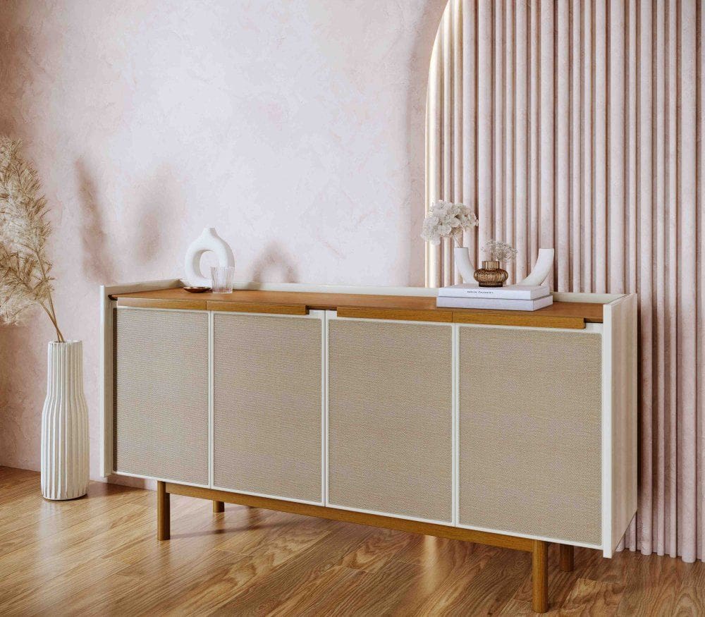 🌾 Buffet Vanda com Tela | 1,60 m A união perfeita entre a tendência natural da tela e a sofisticação do acabamento laqueado para transformar sua decoração.