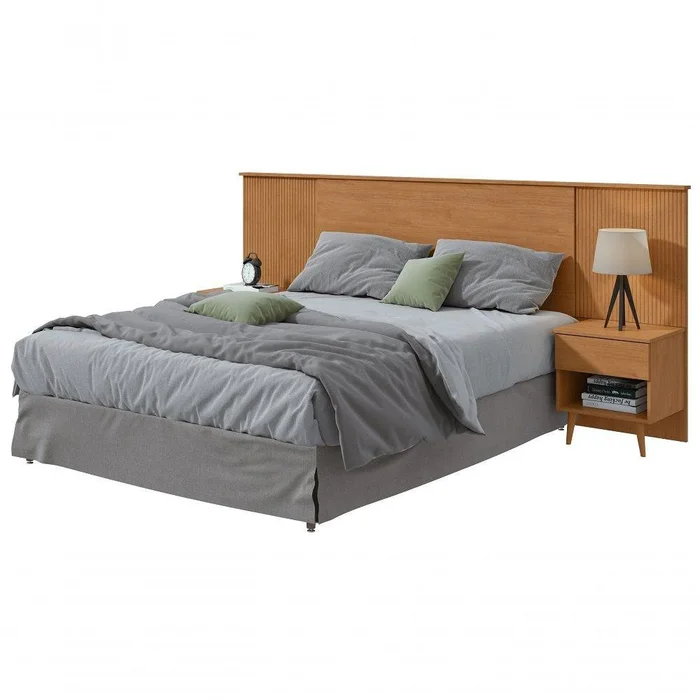 Com estrutura regulável, a Etna se adapta tanto a camas de casal quanto queen (138 a 158 cm), ideal para diferentes tamanhos de colchões. O painel ripado valoriza o ambiente com um toque contemporâneo, enquanto os tons amadeirados trazem aconchego e charme ao espaço.