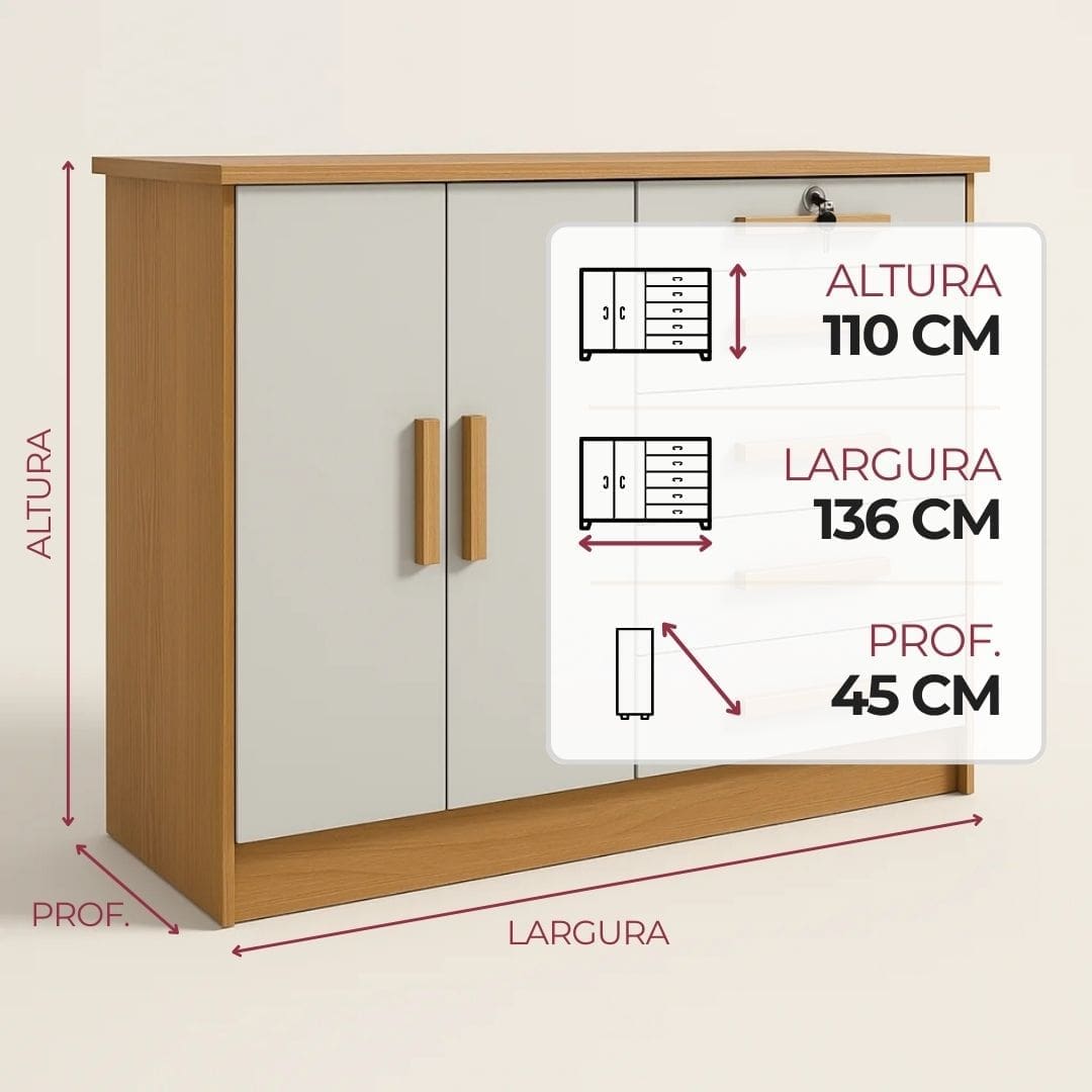 Além disso, o modelo conta com gaveta com chave, perfeita para guardar documentos ou objetos de uso pessoal, e pés opcionais, que permitem adaptar a altura conforme sua preferência.