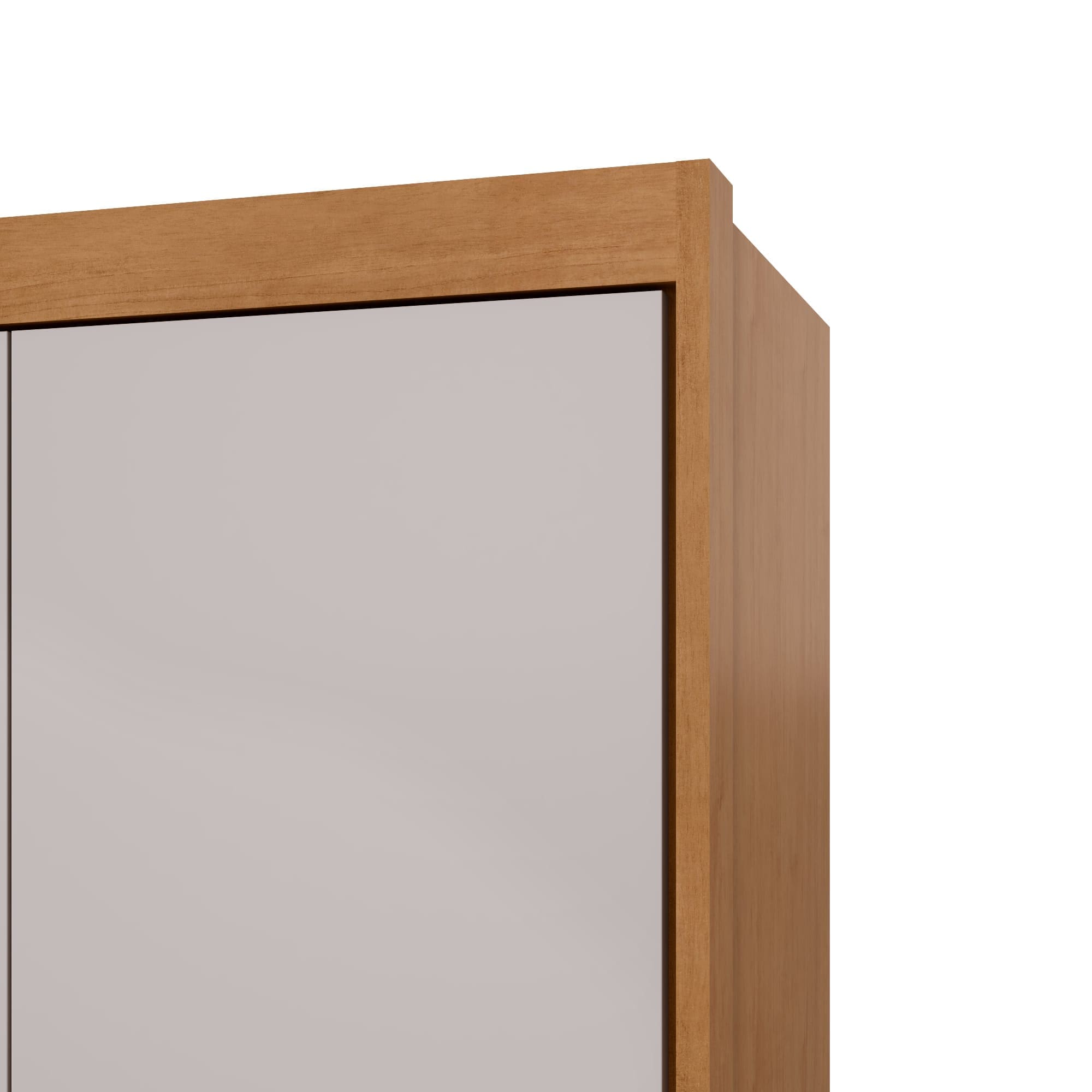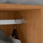 As portas contam com dobradiças metálicas de 35 mm, que oferecem resistência e estabilidade. Os puxadores em MDF mantêm o visual harmonioso, enquanto o espaço exclusivo para sapatos ajuda a manter tudo em ordem no guarda-roupa.