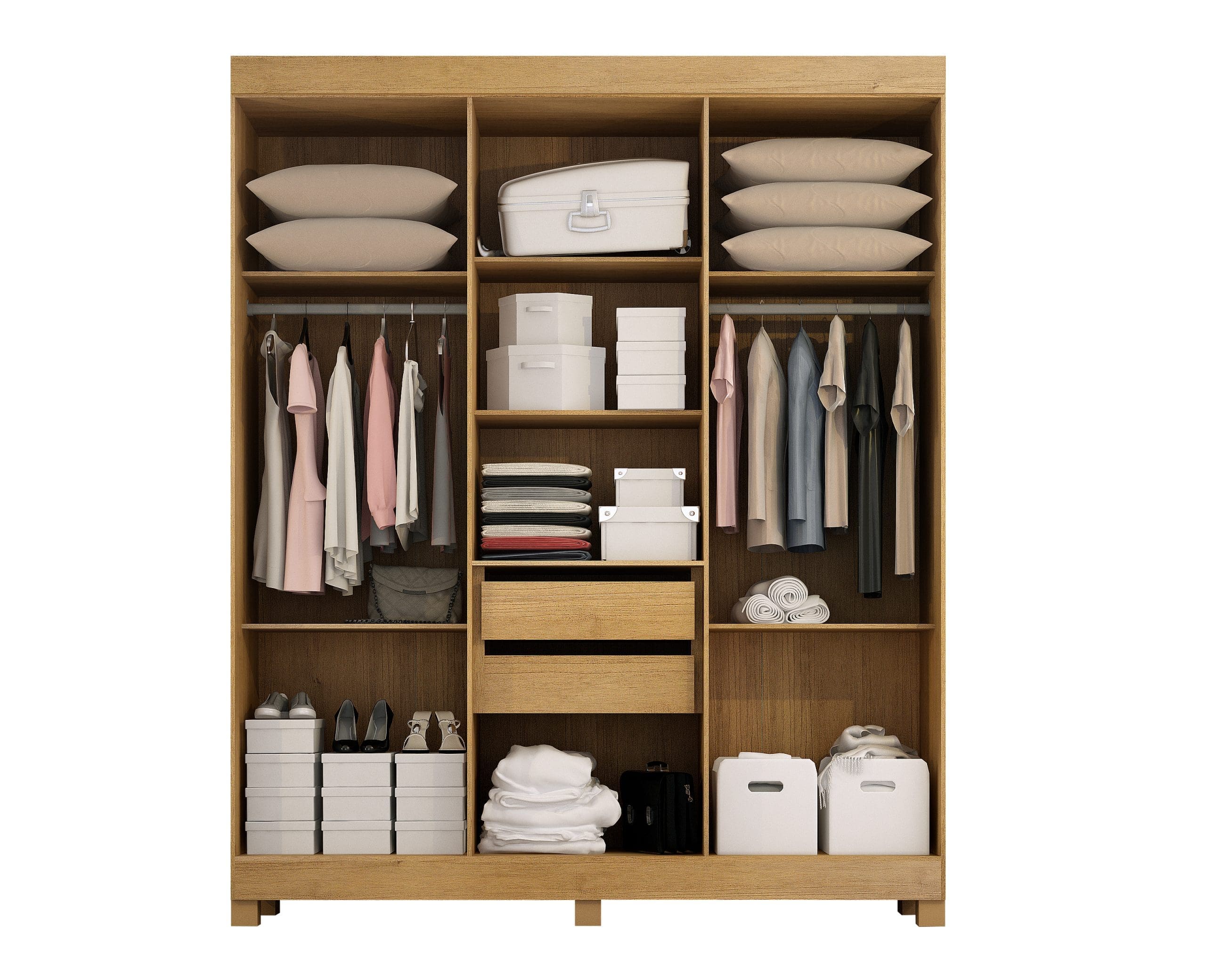 Internamente, conta com 2 gavetas espaçosas com corrediças resistentes, 7 prateleiras bem distribuídas e 2 cabideiros, garantindo praticidade para roupas curtas e longas. Além disso, possui espaço dedicado para sapatos, mantendo tudo sempre em ordem. Os puxadores e pés em MDF trazem uniformidade e elegância ao móvel.