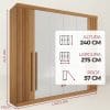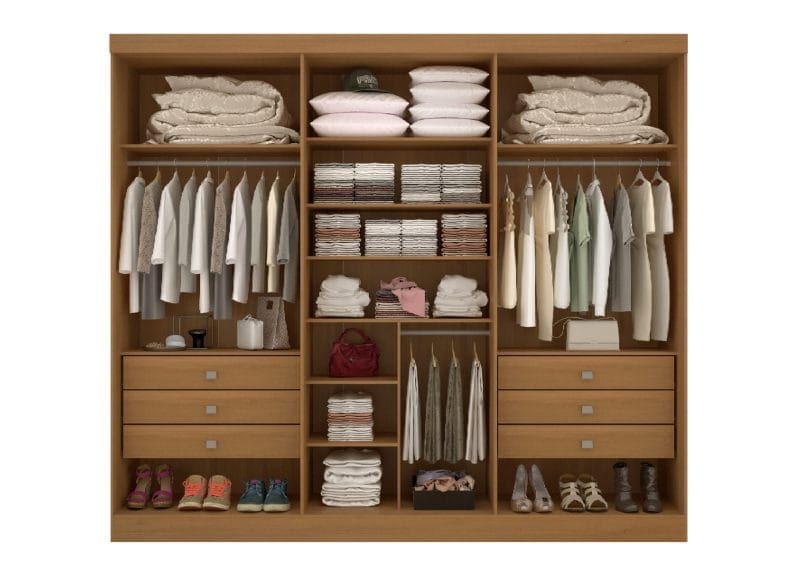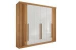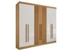 São 6 portas amplas, com puxadores de madeira, que revelam um interior bem distribuído: 6 gavetas com puxadores e corrediças telescópicas de 40 cm, cabideiros metálicos, nichos e prateleiras bem posicionadas. As gavetas têm abertura total e profundidade de 40 cm, ideais para roupas dobradas e acessórios.
