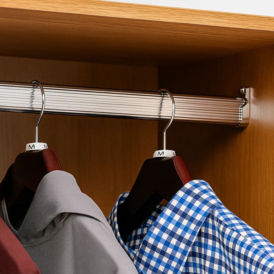 Além disso, o guarda-roupa conta com suporte metálico para cabides, ideal para armazenar roupas com segurança e organização, evitando empenamentos ou desgaste prematuro.
