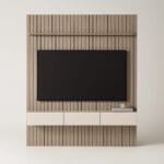 Produzido em MDF e MDP de alta qualidade, o painel combina acabamento ripado de 24 mm com frentes de gavetas em MDF laqueado, garantindo resistência e sofisticação. A prateleira em MDF de 20 mm possui suporte invisível e instalação livre, permitindo ajustar a altura conforme o seu projeto.
