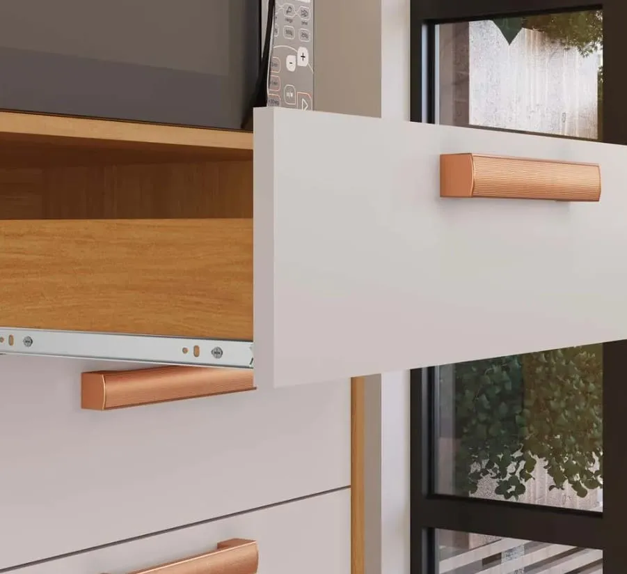 O acabamento nas cores Cinamomo e Off White proporciona um visual moderno e acolhedor, enquanto os puxadores metalizados foscos em rose gold adicionam um toque de sofisticação e exclusividade. O tampo resistente a altas temperaturas (até 120°C) permite apoiar panelas e utensílios quentes com segurança, tornando o dia a dia mais prático e eficiente.