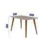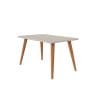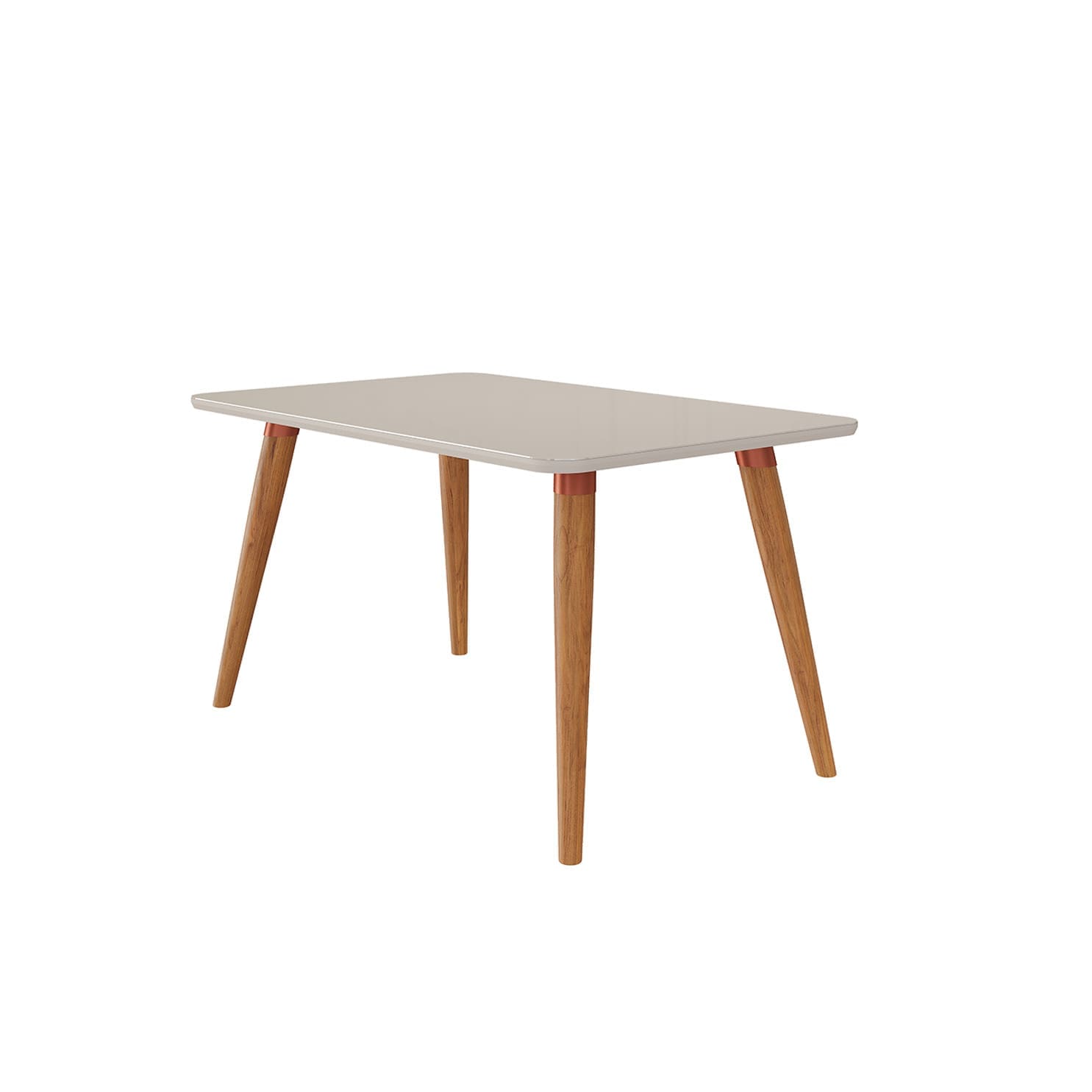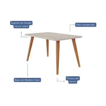 O tampo em vidro temperado Off White de 4 mm com bordas levemente arredondadas garante segurança e praticidade no dia a dia. O suporte metálico na cor cobre acrescenta um toque de requinte, enquanto a base em madeira maciça Tauari com acabamento em verniz proporciona resistência e beleza natural.