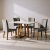 As cadeiras, também em madeira maciça, vêm montadas e são revestidas em tecido Linho, com encosto anatômico, alça de manuseio e espuma D23, suportando até 135 kg. Um conjunto que une resistência, estilo e conforto para o seu dia a dia.