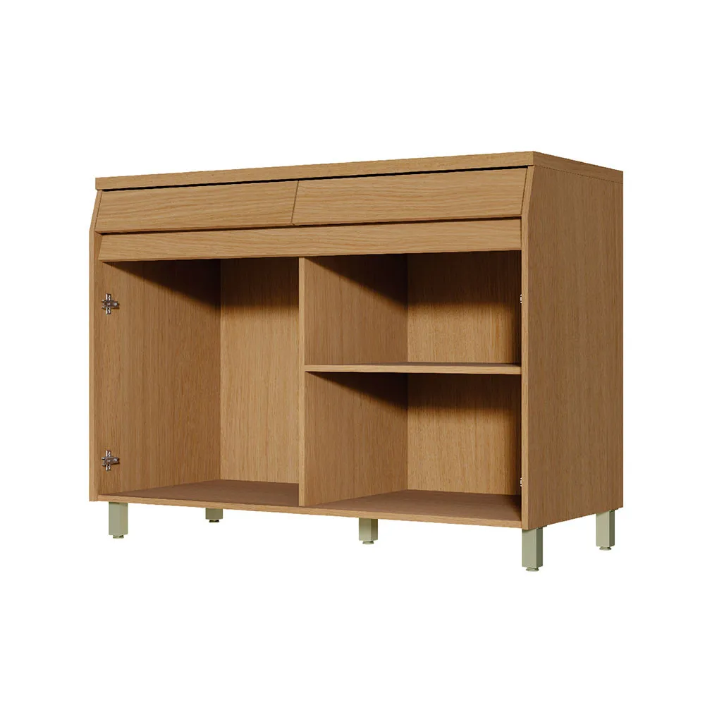O móvel possui 2 portas e 2 gavetas amplas com corrediças telescópicas de 3 estágios e abertura total, permitindo fácil acesso aos utensílios. Entre os diferenciais, destacam-se o organizador de talheres integrado e os puxadores tipo gola, que valorizam o design clean e minimalista. O tampo de 30 mm em MDF reforça a robustez, enquanto os pés de 10 cm facilitam a limpeza do espaço.