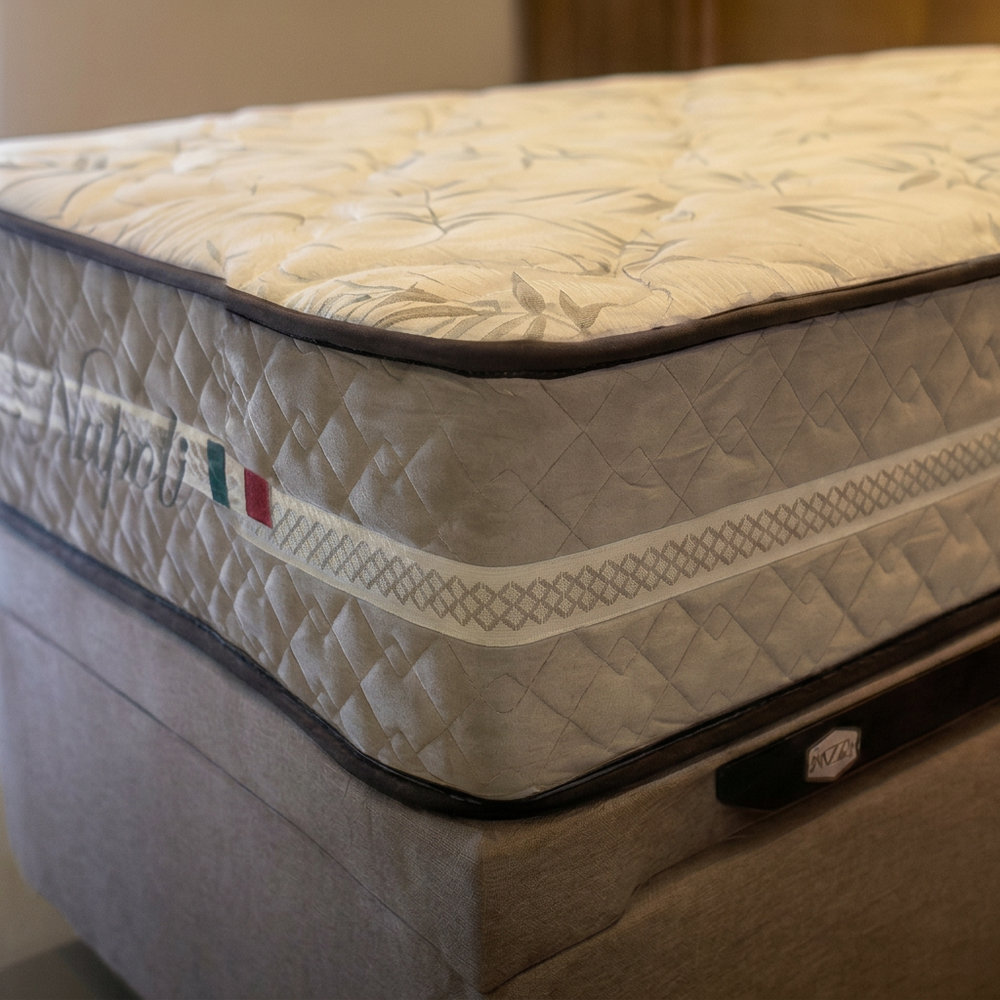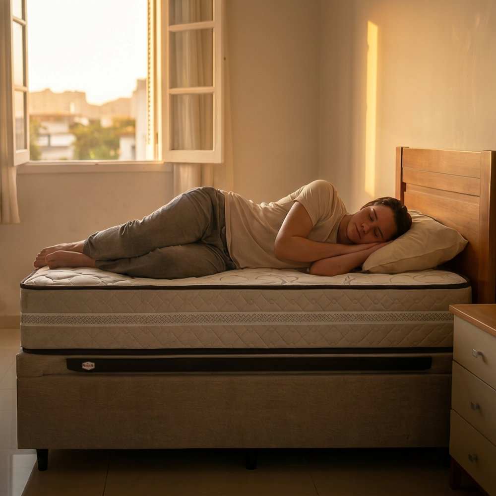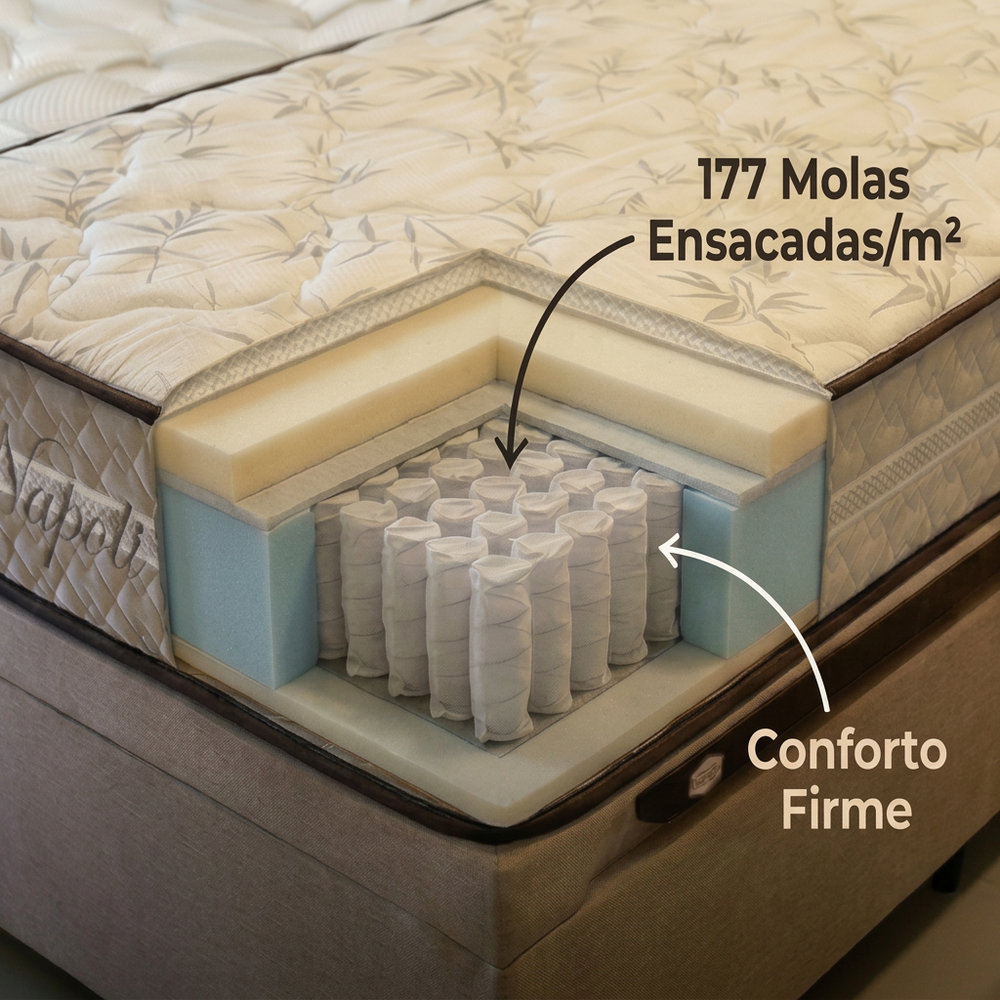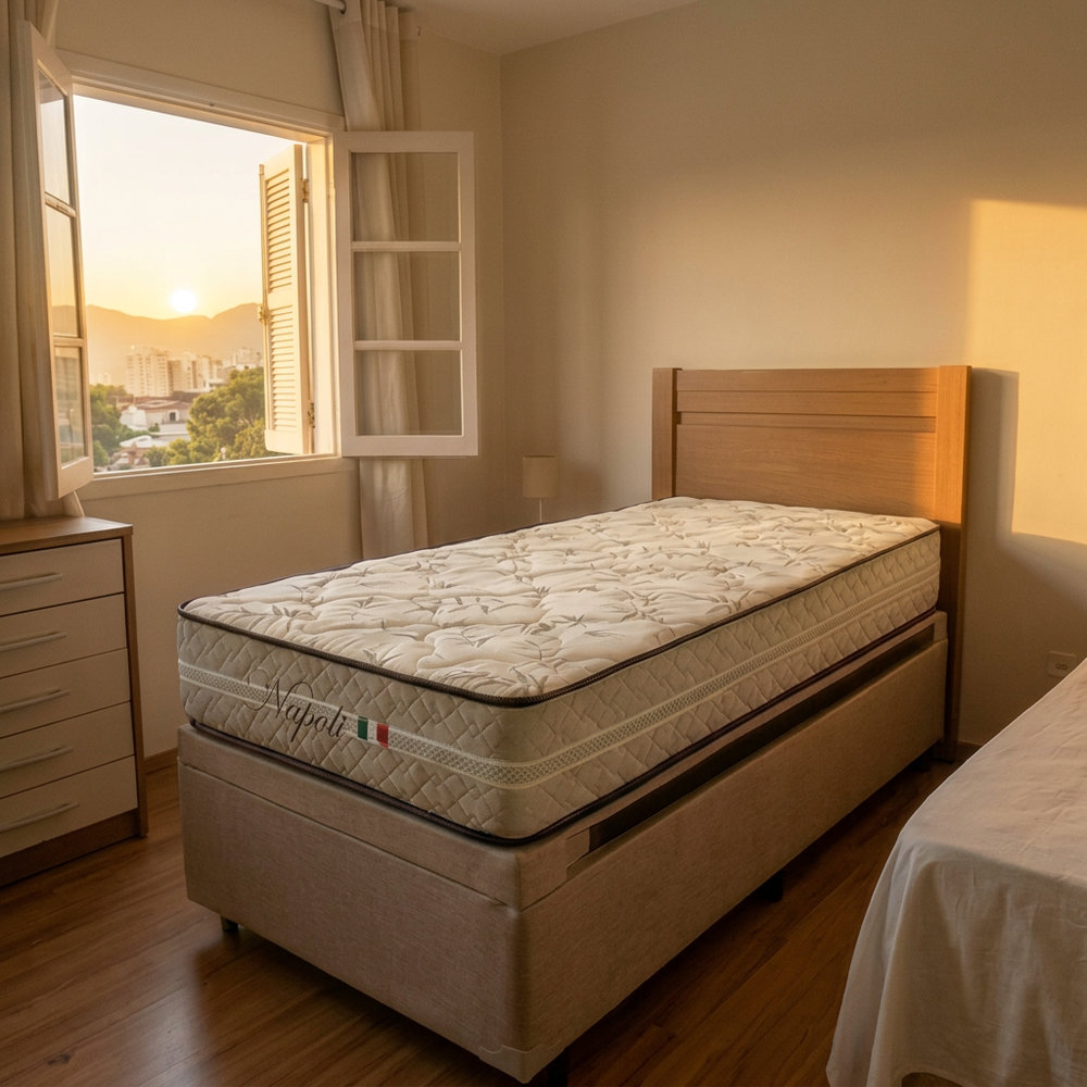 Com 24 cm de altura e estrutura firme que não afunda no centro com o uso, o Napoli entrega conforto real sem aquela sensação de cama velha afundando no meio.