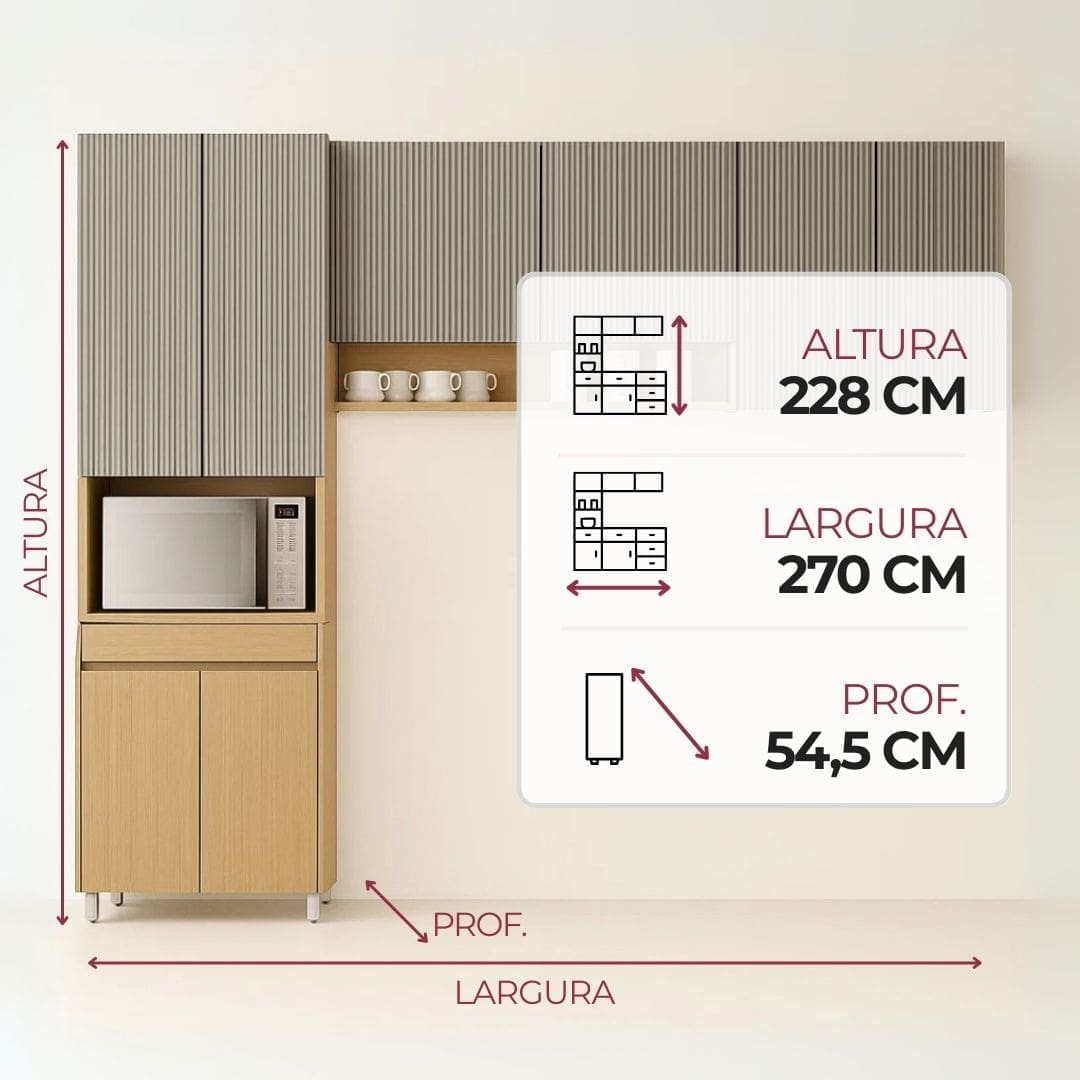 Conjunto de Cozinha Simone Mendes 3 Peças 2.70m - Carvalho/Greige