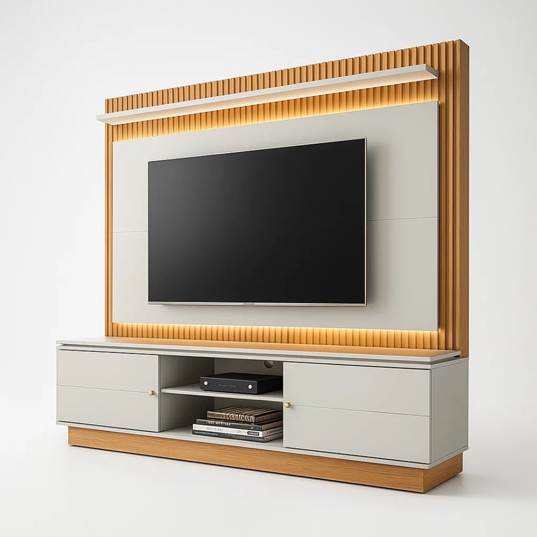 O Home Saragoça foi criado para quem busca transformar a sala de estar com um toque de sofisticação e funcionalidade. Compatível com TVs de até 75 polegadas, o móvel se destaca pelo painel ripado com iluminação em LED, que valoriza o ambiente com uma estética moderna e acolhedora.