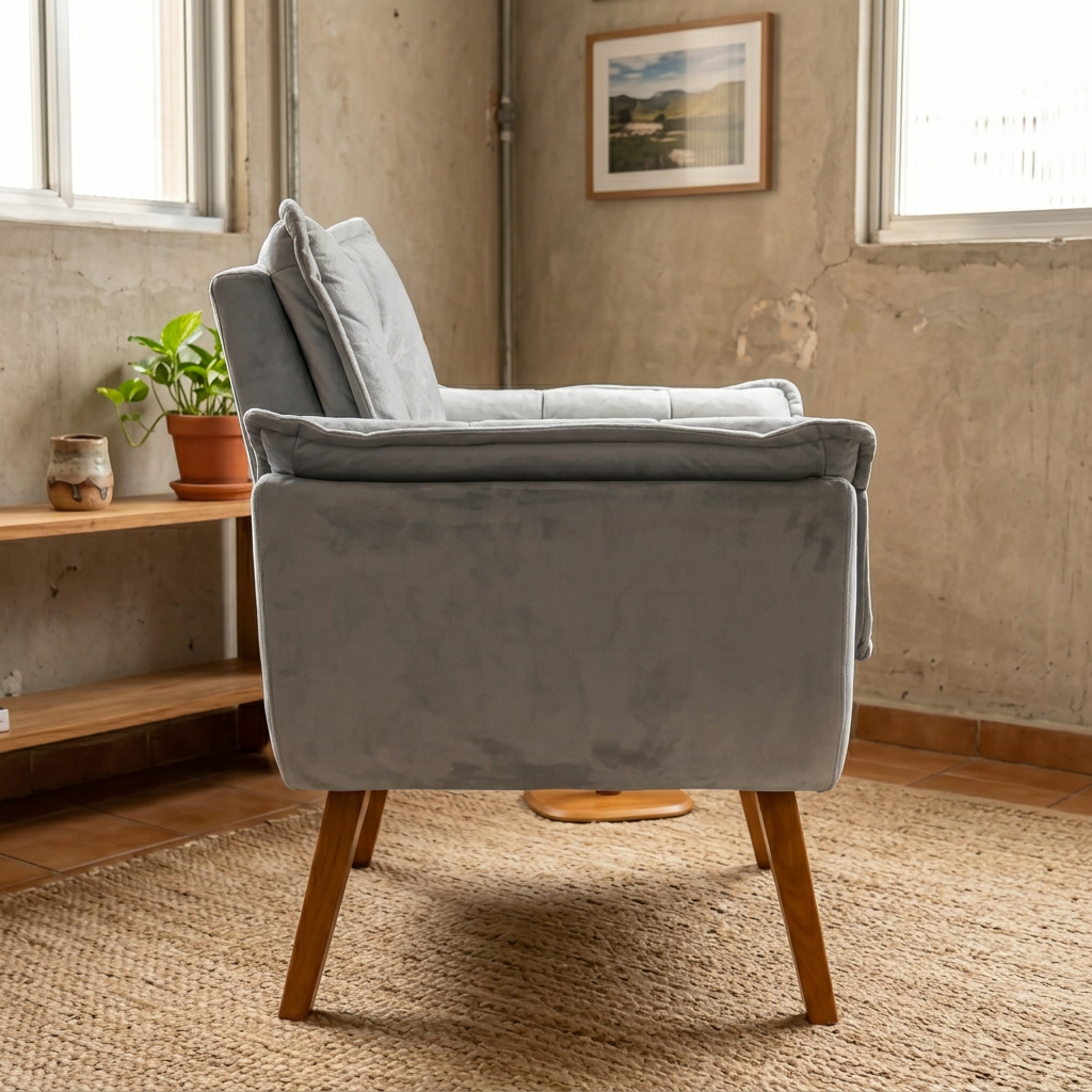 Revestida em Veludo Jolie Prata, de toque macio e brilho sutil, a peça adiciona elegância e requinte ao ambiente. Os braços integrados proporcionam apoio adicional e um visual harmonioso, enquanto a estrutura reforçada garante durabilidade e estabilidade.