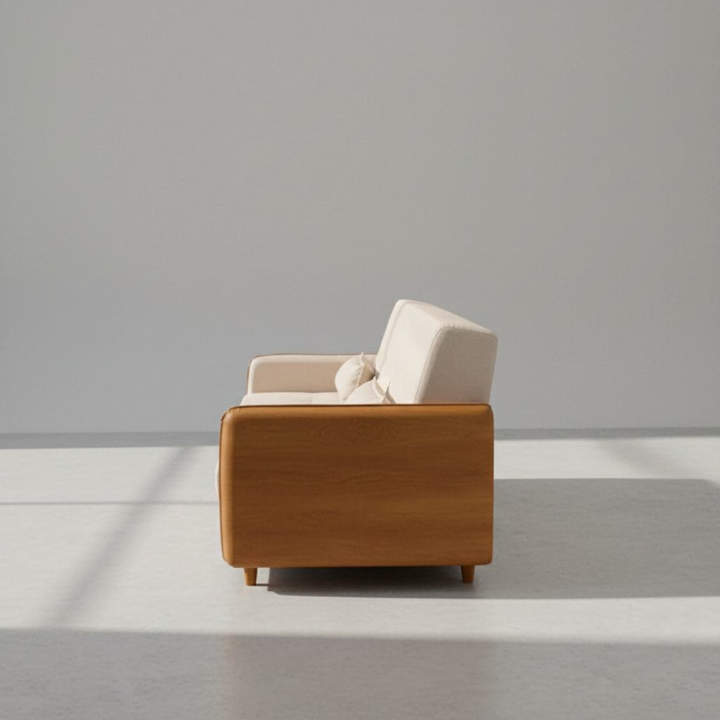 Os assentos em espuma D26 com percintas elásticas entrelaçadas proporcionam firmeza e maciez na medida certa. Já os braços em espuma D23 são parafusados, permitindo desmontagem em mudanças ou ambientes de difícil acesso. Os pés em madeira de eucalipto com acabamento em verniz completam o visual com toque natural e elegante.