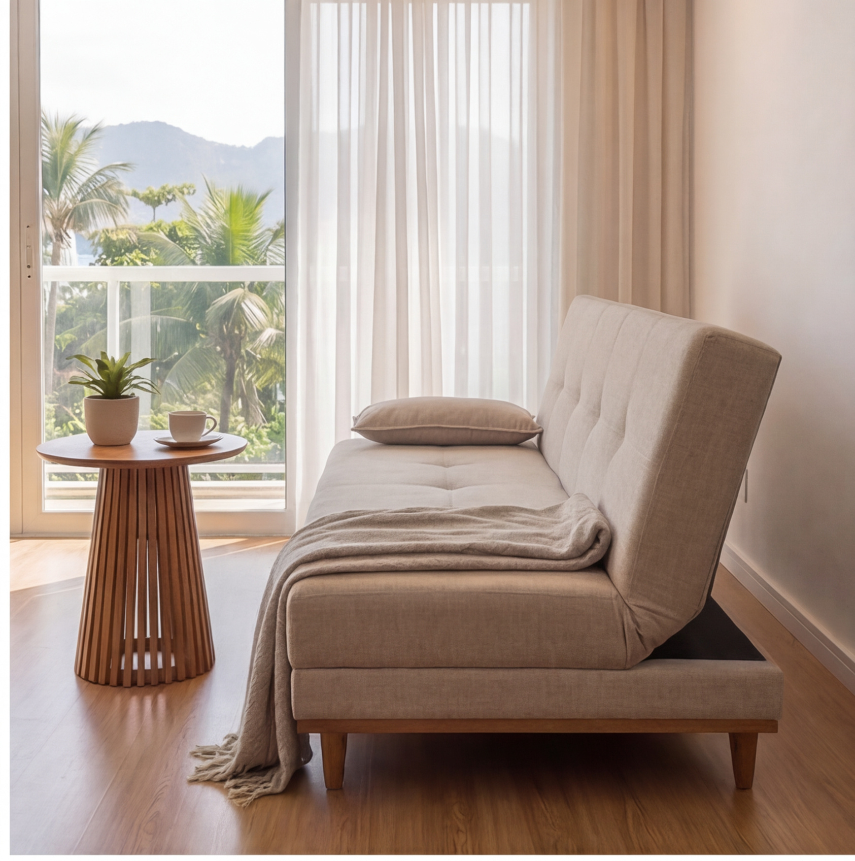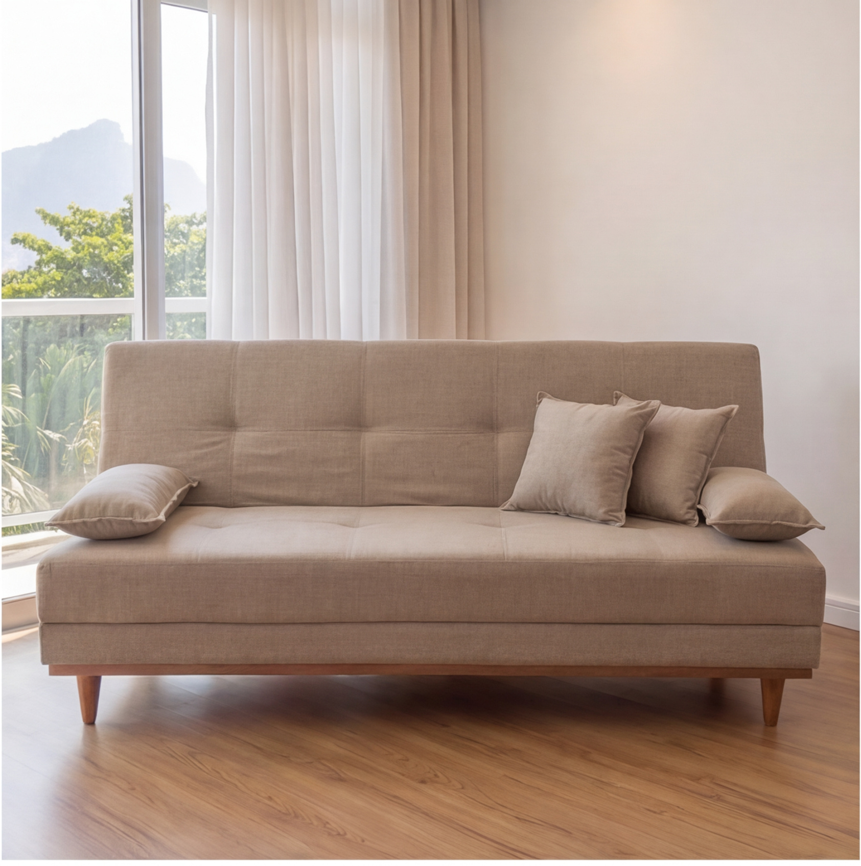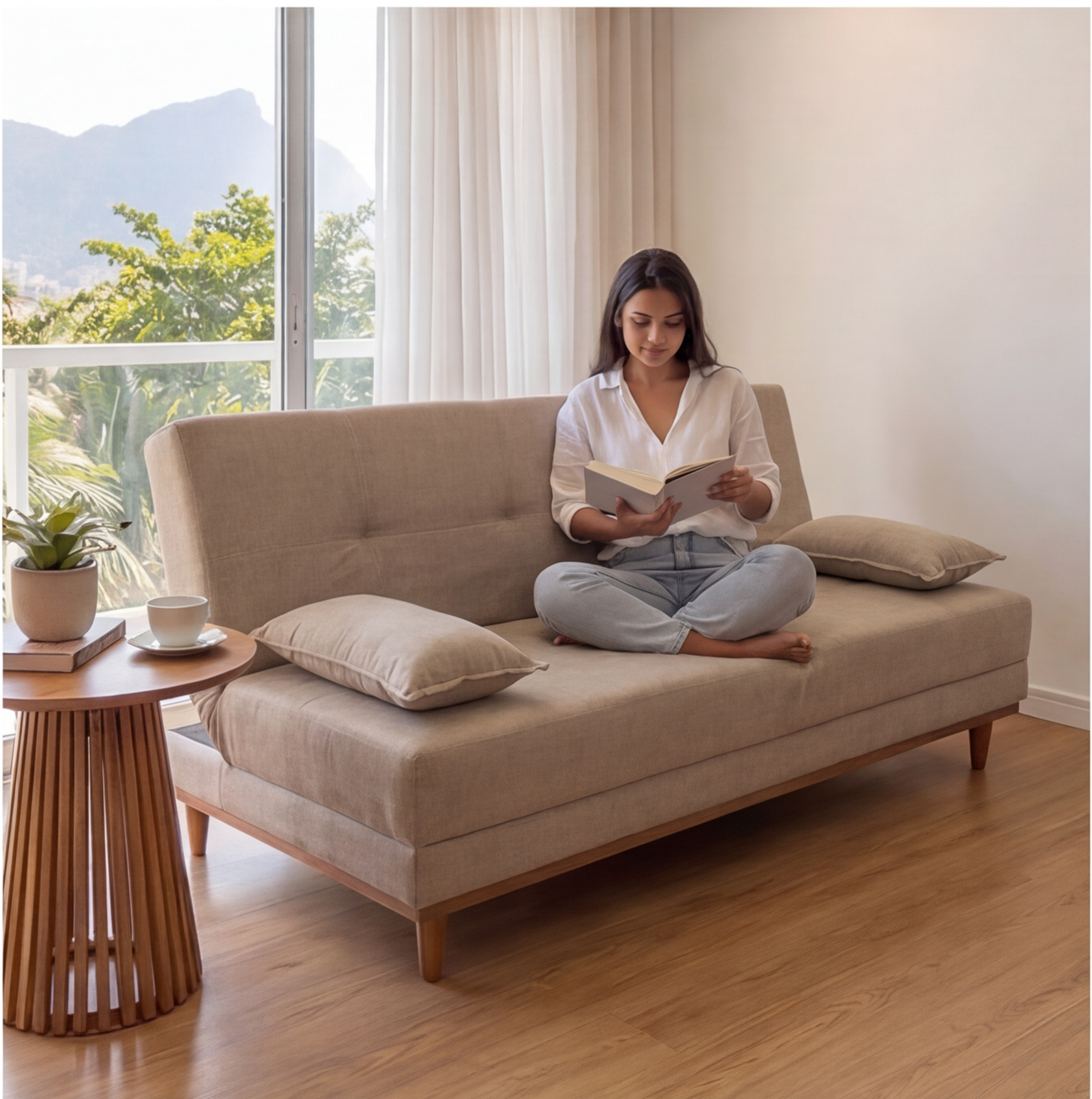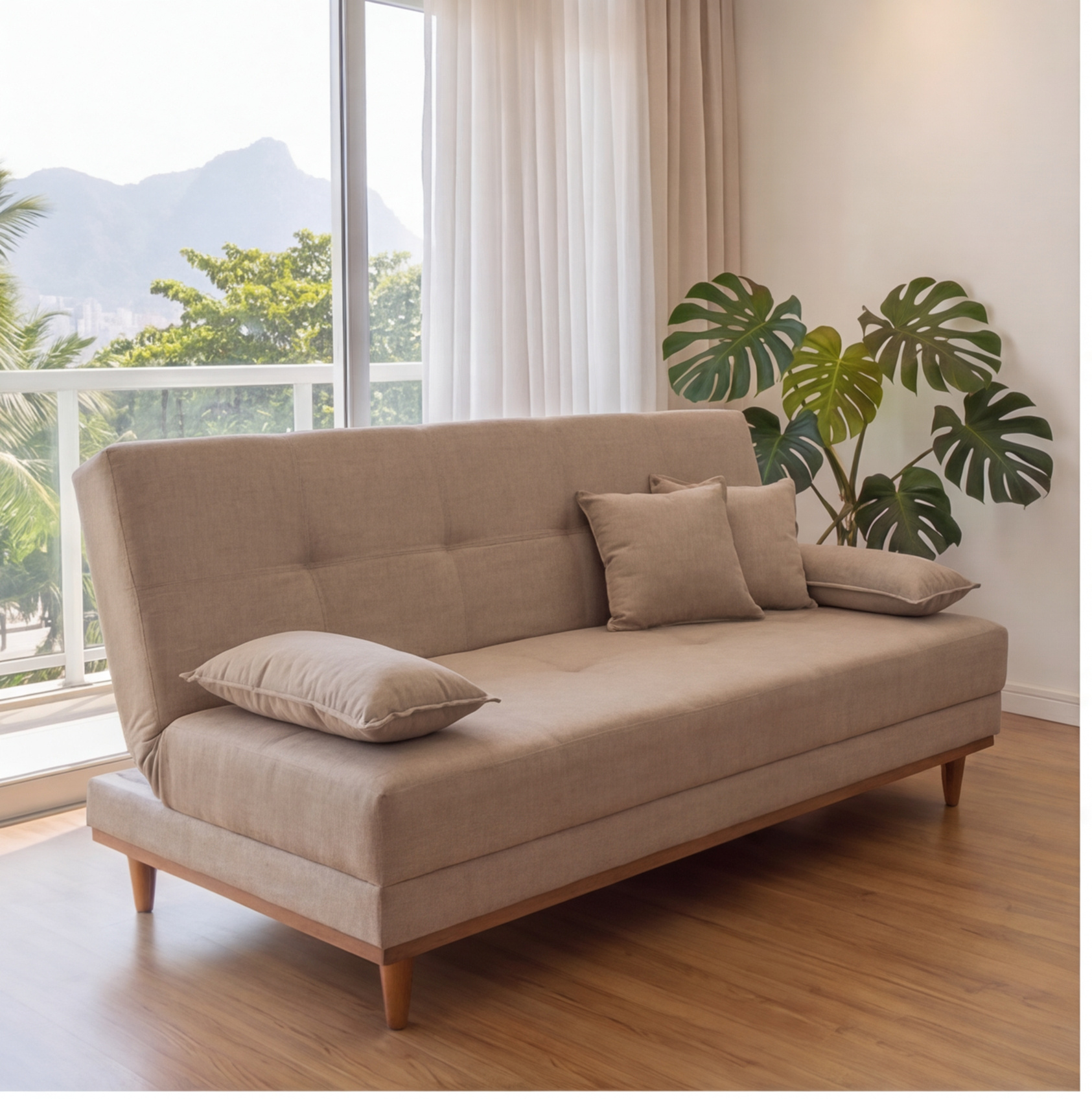 O Sofá-Cama Madrid é a escolha perfeita para quem precisa de um móvel versátil que une praticidade e elegância. Revestido em tecido veludo bege acinzentado, ele oferece toque macio e visual sofisticado, adaptando-se a diversos ambientes como salas, quartos, escritórios ou espaços compactos.