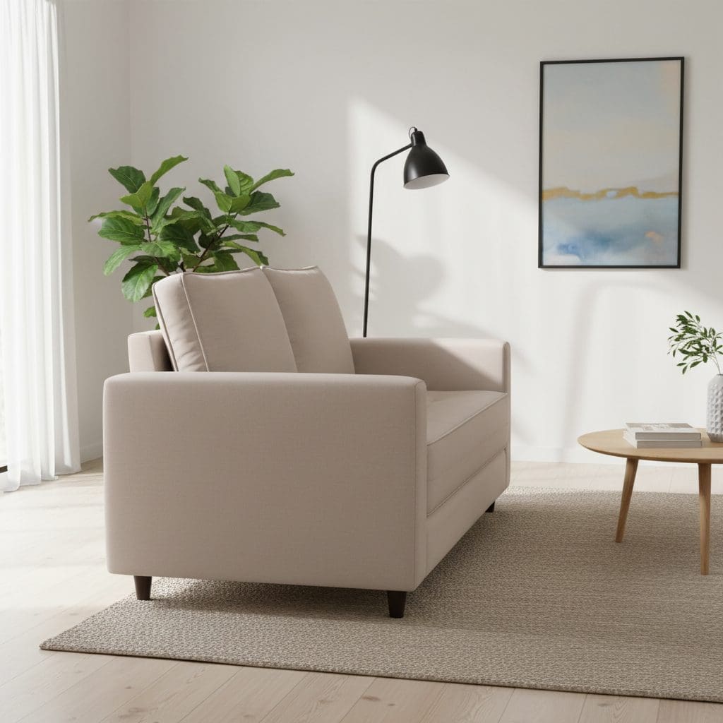 Seu assento é composto por espuma de colchão D28, revestida com manta D20 soft e manta acrílica fina, garantindo conforto superior tanto para sentar quanto para dormir. O encosto fixo com espuma D26 proporciona firmeza e suporte ideal para as costas, enquanto as almofadas soltas com enchimento em fibra siliconada entregam um toque de leveza e maciez incomparáveis.