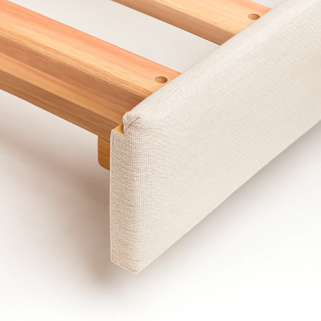 - Revestimento em tecido bege: neutro, elegante e fácil de harmonizar