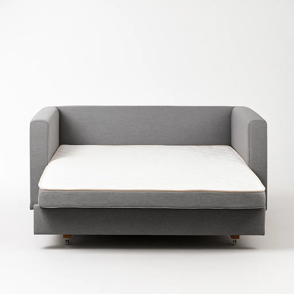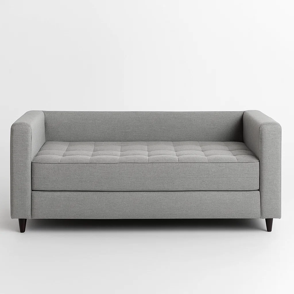 O assento é composto por espuma especial de colchão D28, revestida com manta D20 soft e manta acrílica fina, garantindo maciez e suporte equilibrado tanto para sentar quanto para dormir. O encosto fixo em espuma D26 oferece firmeza e conforto na postura, enquanto as almofadas soltas com enchimento em fibra siliconada completam a sensação de aconchego e bem-estar.