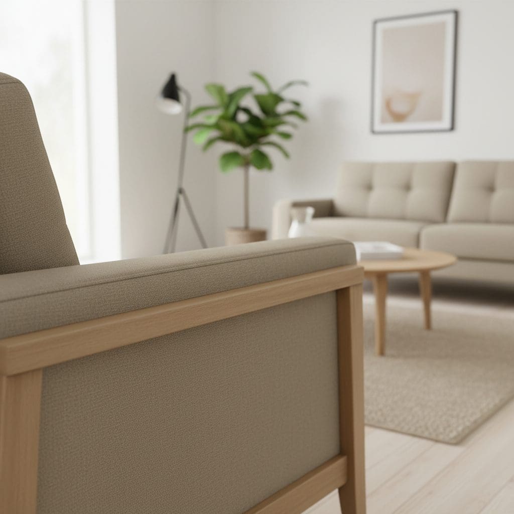 O assento é fabricado com espuma D33, molas em aço tipo “S” e percintas elásticas, garantindo sustentação firme e conforto prolongado. O encosto, composto por almofadas soltas em fibra siliconada, oferece maciez e adaptação ao corpo. Os braços com espuma D33 e os pés em madeira maciça completam o design, unindo robustez e sofisticação ao conjunto.