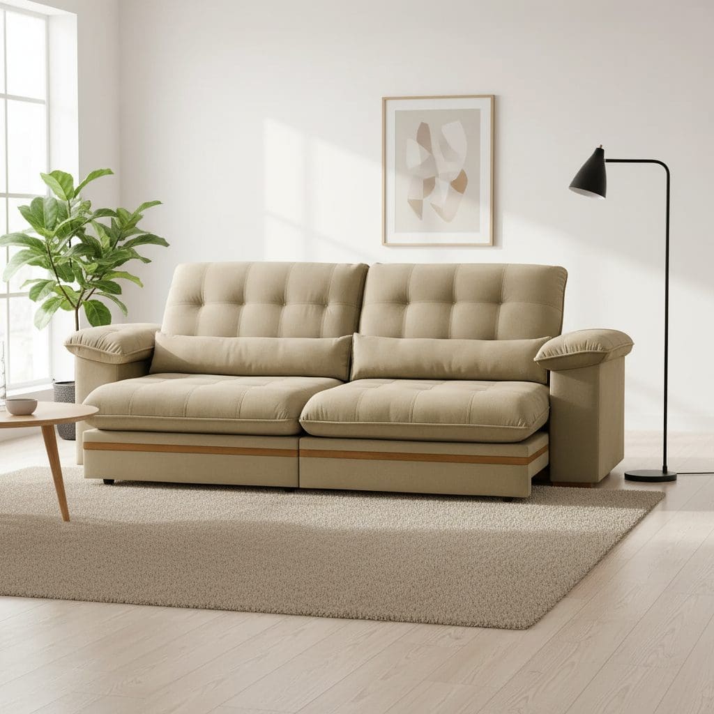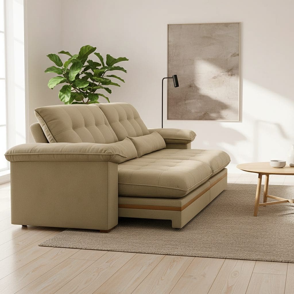 O Sofá Porto Retrátil e Reclinável é ideal para quem deseja transformar a sala em um espaço de puro relaxamento, sem abrir mão de sofisticação. Com 2,50 m de largura, ele combina estrutura reforçada em madeira de reflorestamento com detalhes em madeira maciça, resultando em um móvel robusto e elegante. Além disso, é um sofá retrátil que se adapta perfeitamente às necessidades do seu dia a dia.