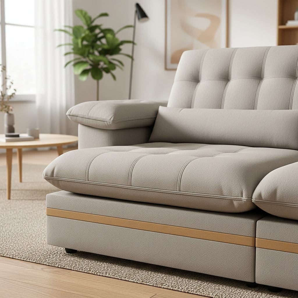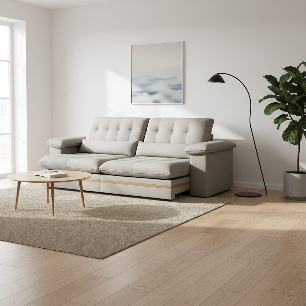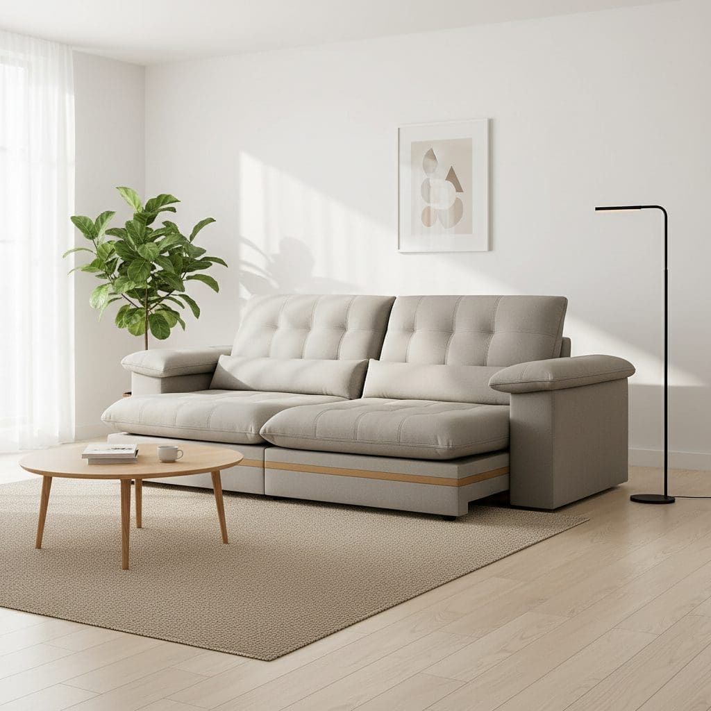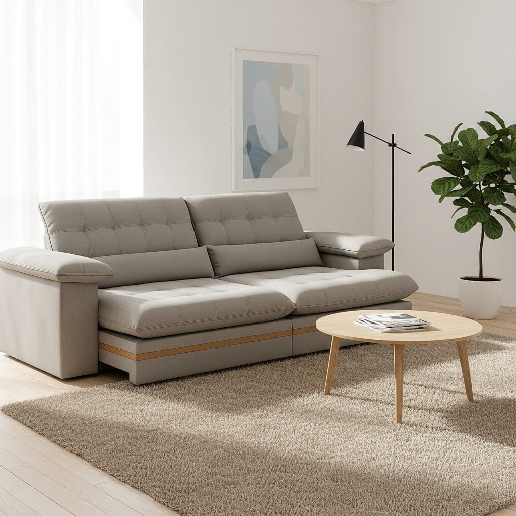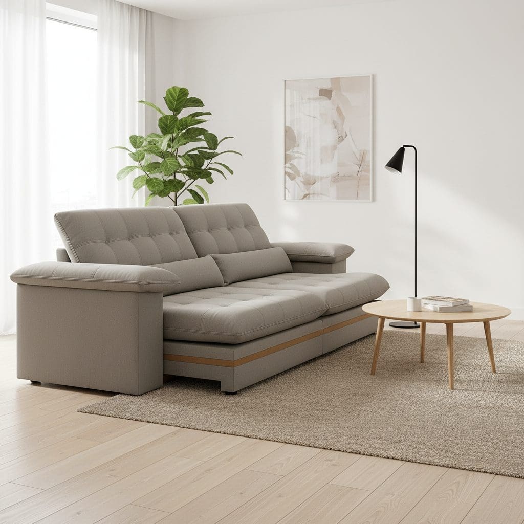 O Sofá Porto Retrátil e Reclinável oferece o máximo em conforto, modernidade e durabilidade para sua sala de estar. Revestido em veludo cinza claro, ele une visual elegante e toque macio. Sua estrutura reforçada em madeira de reflorestamento com detalhes em madeira maciça garante resistência e sofisticação. Ideal para quem procura um sofá retrátil que combine estilo e funcionalidade.