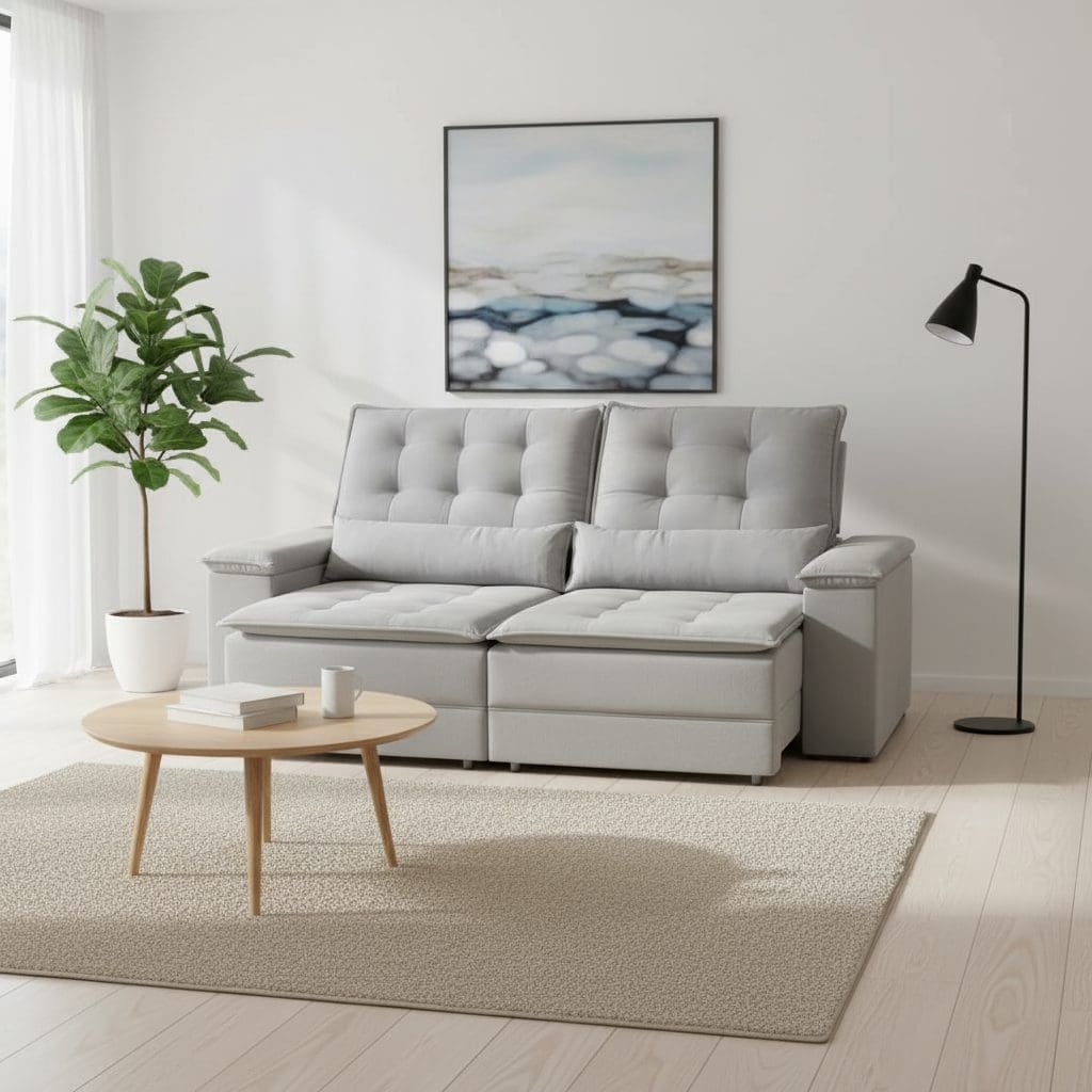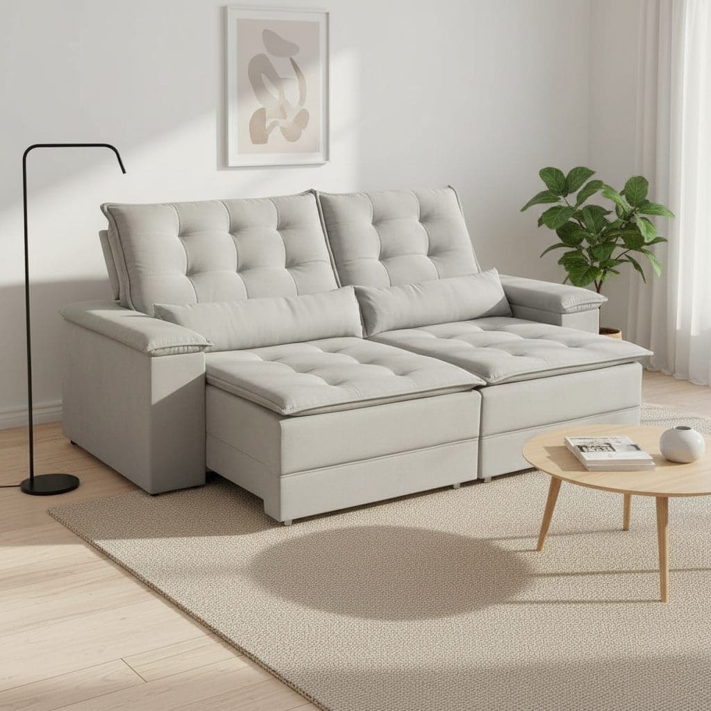 Seu design retrátil e reclinável garante o máximo de conforto: os assentos estendidos atingem 1,80 m de profundidade, oferecendo espaço ideal para relaxar. A estrutura é reforçada e os assentos contam com espuma D28 certificada, que une firmeza e durabilidade, mantendo o conforto mesmo após longos períodos de uso.