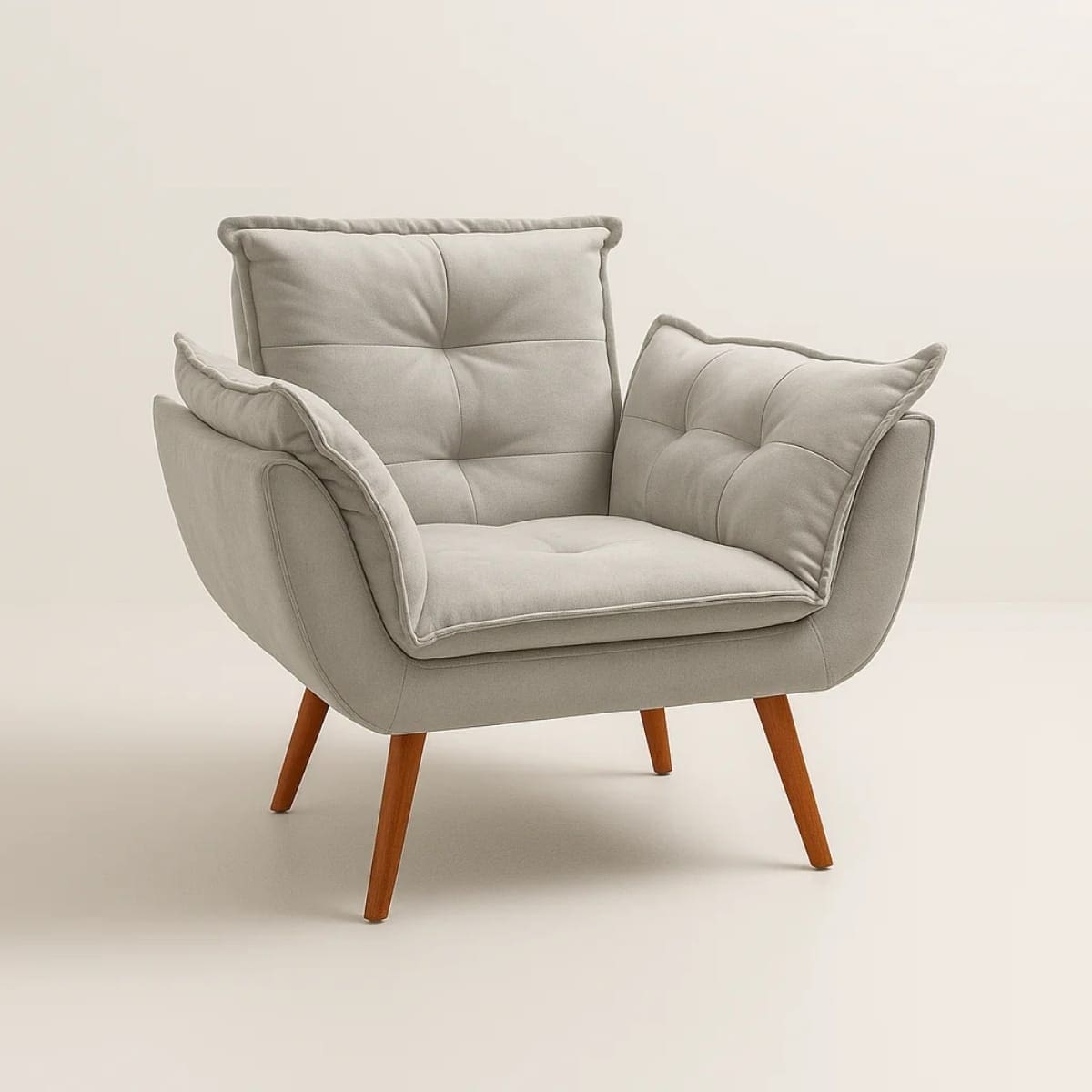 tecido Jolie, de toque macio e visual sofisticado, a poltrona proporciona aconchego imediato ao sentar. Seu design com braços integrados e encosto ergonômico favorece uma postura relaxada e elegante.