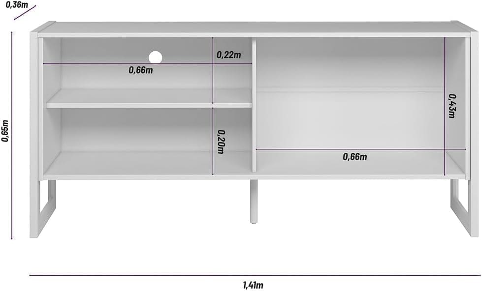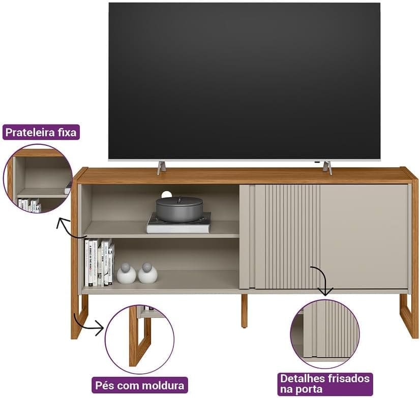 Perfeito para TVs de até 55 polegadas, o modelo conta com prateleira central para eletrônicos ou decoração, além de pés laterais com moldura, que garantem estabilidade e um visual equilibrado. Fabricado em MDP e MDF, o rack oferece resistência, leveza e acabamento refinado — ideal para compor salas compactas ou integradas.