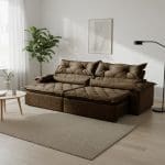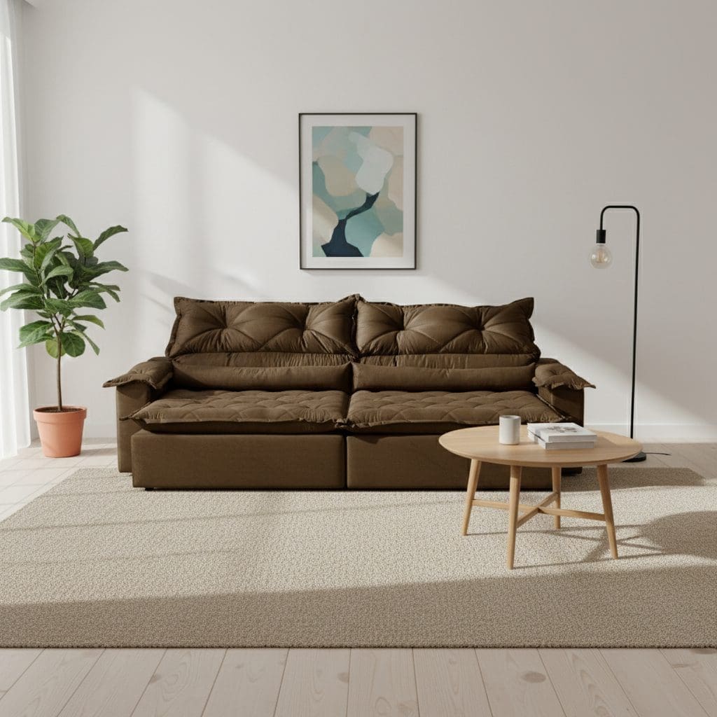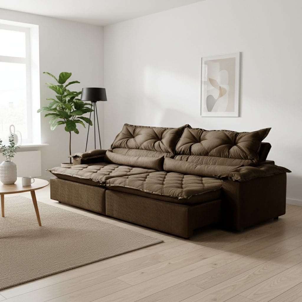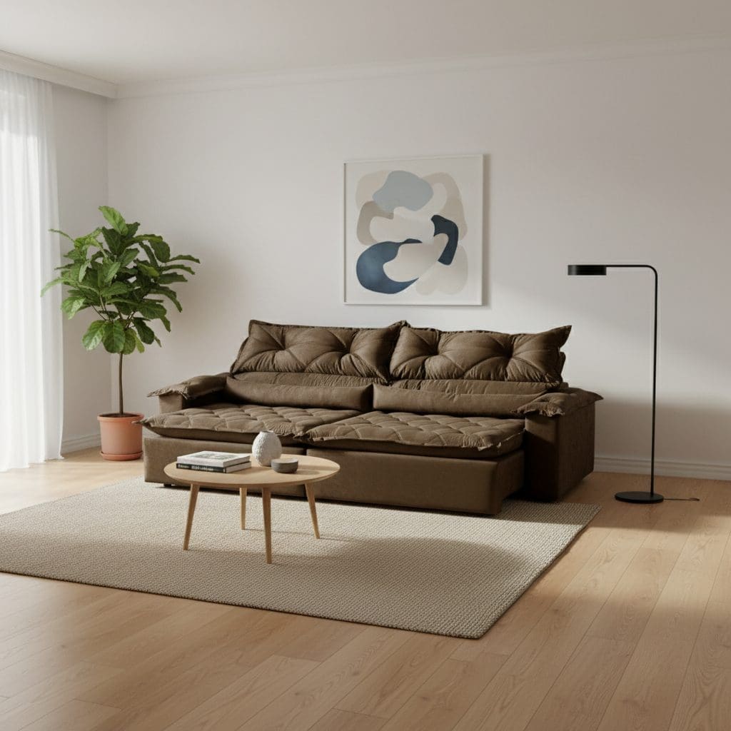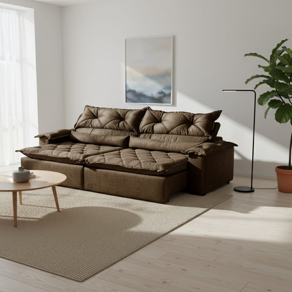 O Sofá Âmbar Retrátil e Reclinável 240 cm combina conforto, resistência e sofisticação para transformar sua sala em um verdadeiro espaço de relaxamento. Revestido em veludo Jolie marrom, ele traz elegância e aconchego, além de ser fácil de harmonizar com diferentes estilos de decoração.