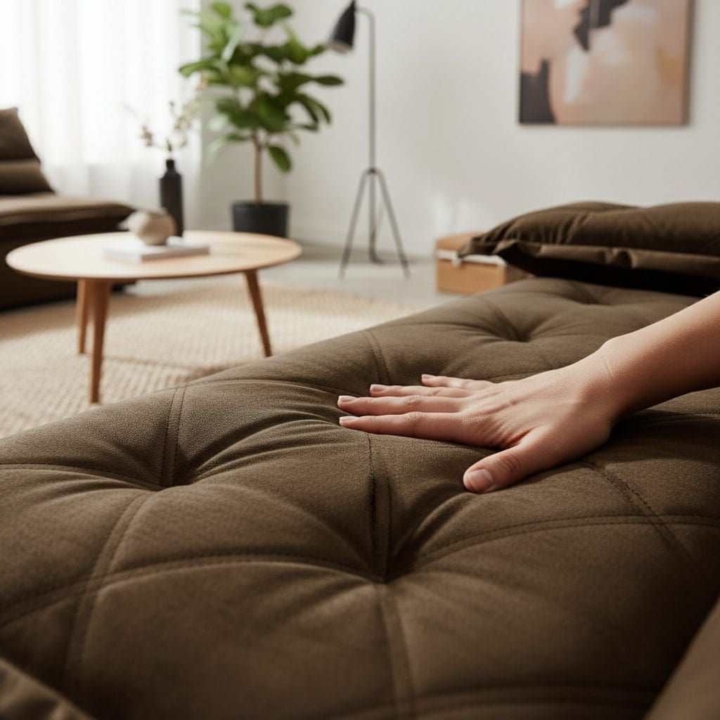 O assento retrátil conta com mecanismo em tubo metálico e rodízios de silicone, proporcionando abertura prática e suave. O pillow de 15 cm, preenchido com espuma D26 softy, oferece maciez superior, enquanto as almofadas soltas com fibra siliconada e manta acrílica garantem um encosto aconchegante.