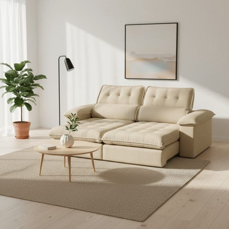- Encosto: Reclinável em múltiplos estágios, com almofadas preenchidas 100% com fibra siliconada e manta acrílica, proporcionando máximo aconchego.