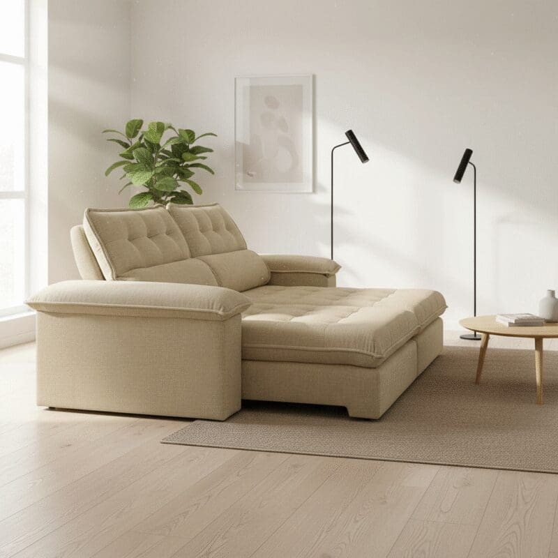 - Tipo: Sofá com assentos retráteis e encostos reclináveis.