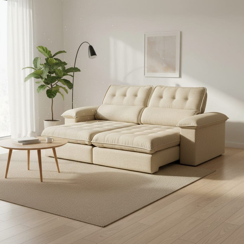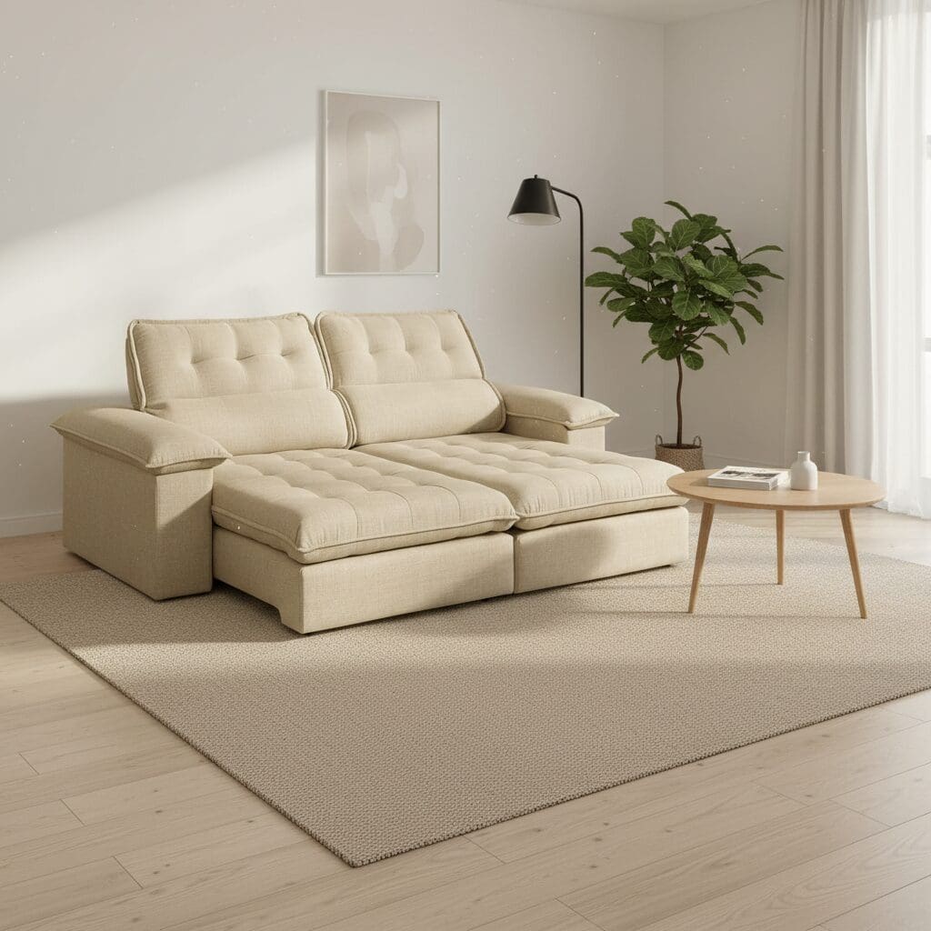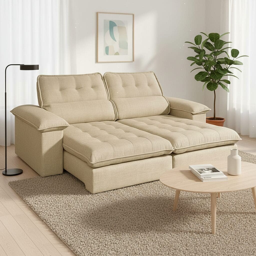 - Tipo: Sofá com assentos retráteis e encostos reclináveis.